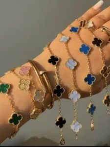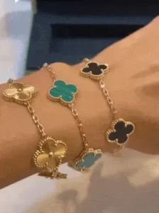 Four-leaf clover bracelets symbolize luck and good fortune. Each leaf represents different meanings such as love, health, wealth, and happiness. Four-leaf clover bracelets are considered a talisman, symbolizing good luck and auspiciousness. They have become a classic style and enjoy widespread attention and popularity. They bring blessings and auspiciousness to the wearer.